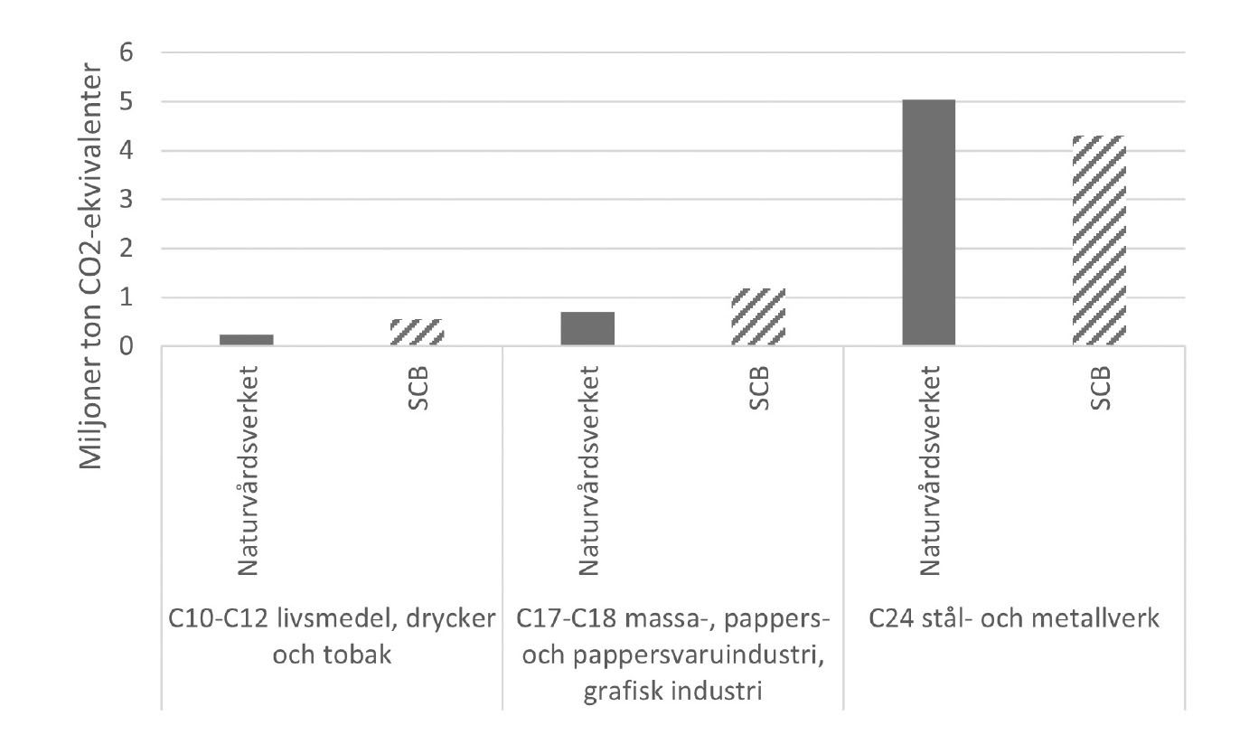 För att illustrera detta jämför vi här klimatstatistik från Naturvårdsverket och SCB för tre industribranscher: livsmedel, massa/papper samt järn och stål. Vid en första anblick verkarsiffrorna gälla samma verksamheter, men resultaten skiljer sig ändå åt. Naturvårdsverkets siffror är lägre för livsmedel och papper, men högre för stål. Det beror på att de två myndigheterna använder olika sätt att räkna – något som kan göra stor skillnad i hur siffrorna ska tolkas.